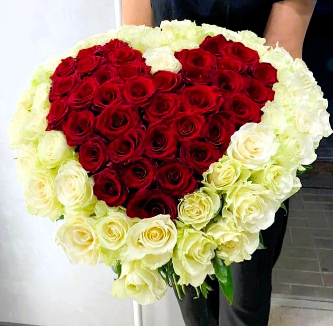 Букет в форме сердца из красных и белых роз: символ любви и нежности!