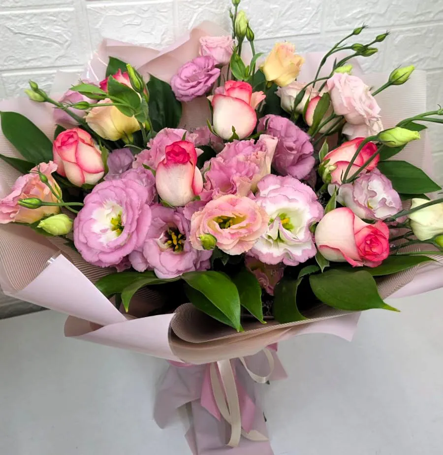Сочетание роз и эустомы создает неповторимый визуальный эффект, где каждая деталь подчеркивает красоту другой. Розы привносят страсть и классику, а эустома – воздушность, нежность и современность. Этот стильный букет станет идеальным дополнением к любому событию, от официального мероприятия до личного праздника.
