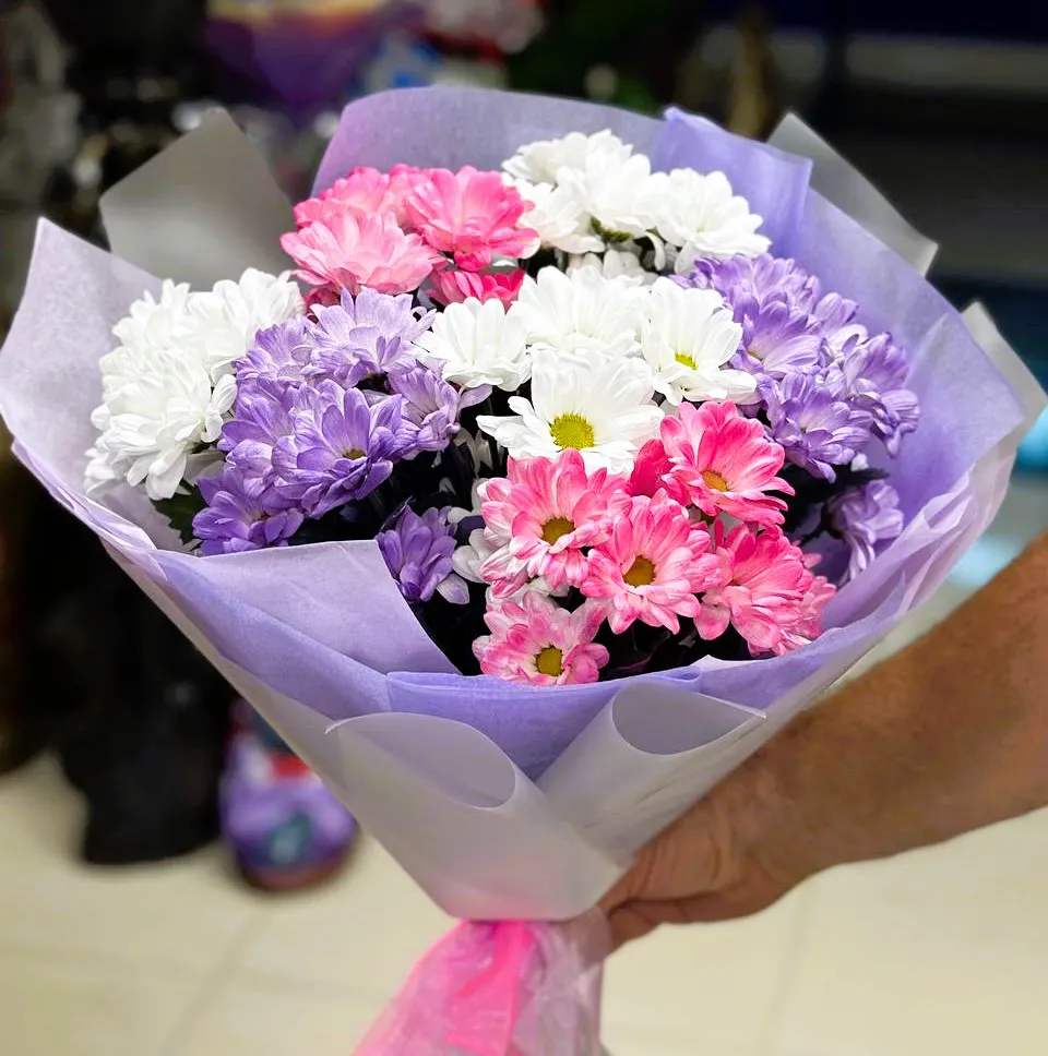 В мире цветов кустовые хризантемы занимают особое место благодаря своей яркой палитре и великолепной форме. Букет, составленный из розовых, фиолетовых и белых хризантем, станет прекрасным украшением любого праздника и искренним подарком для близких.