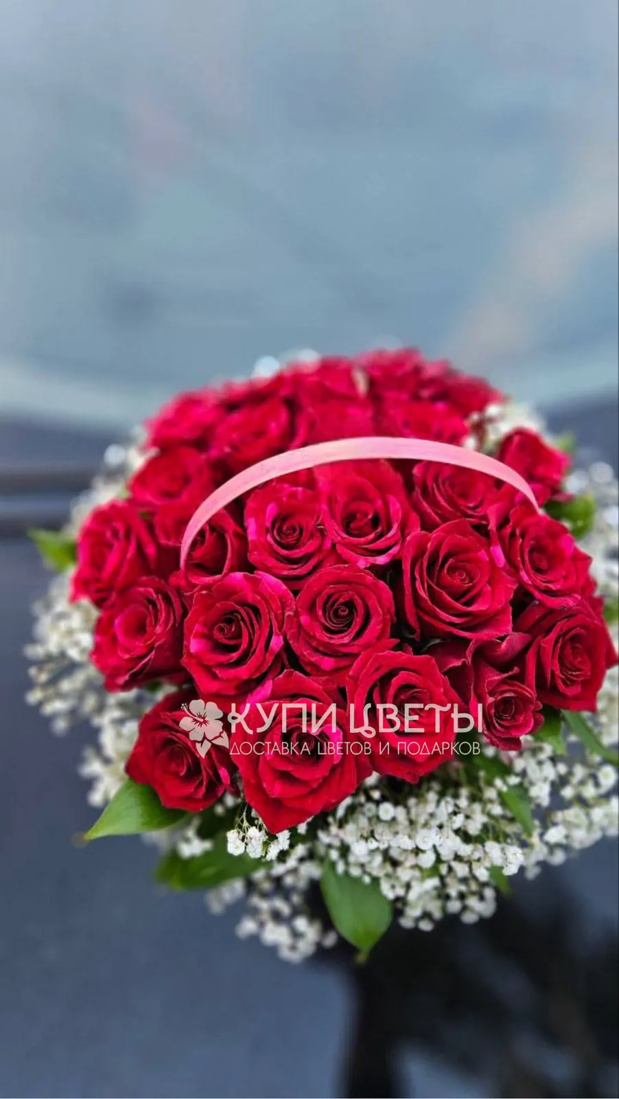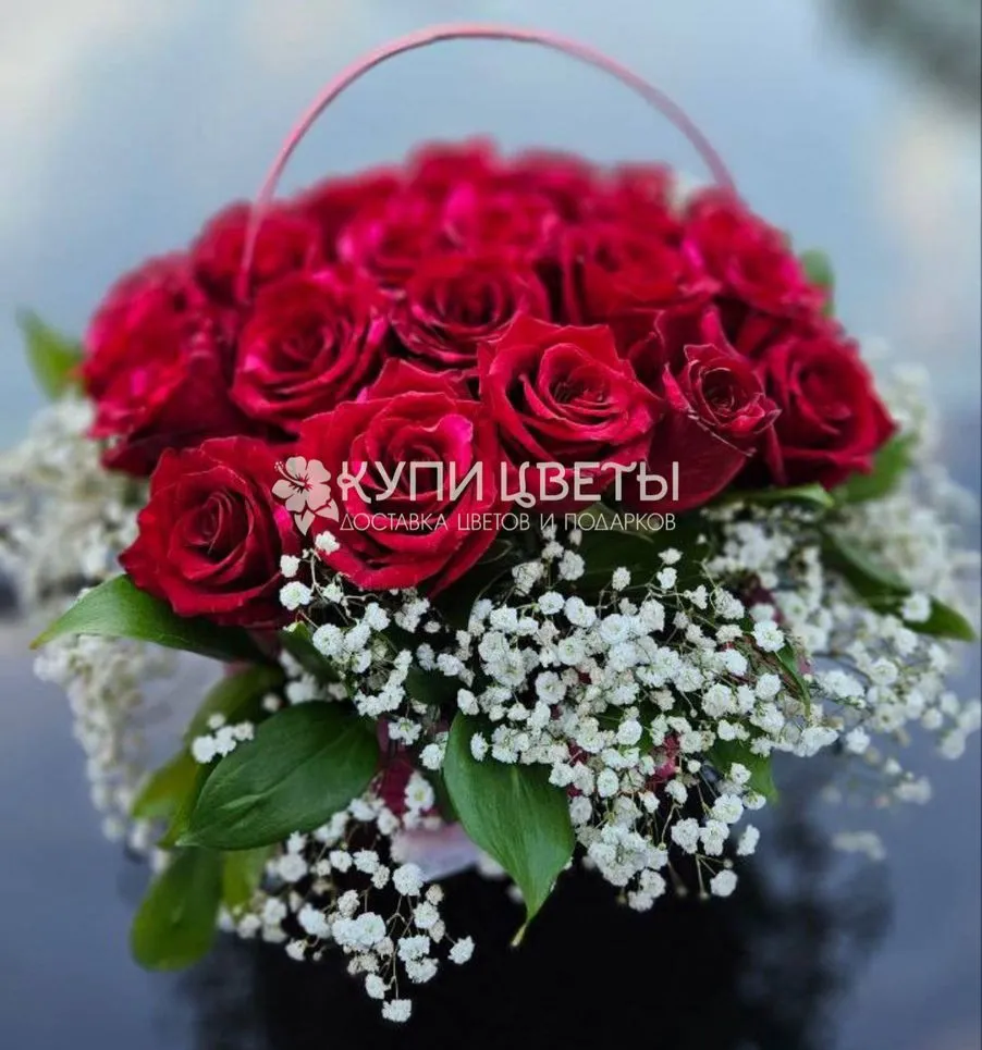 —Корзина с красными розами и гипсофилой