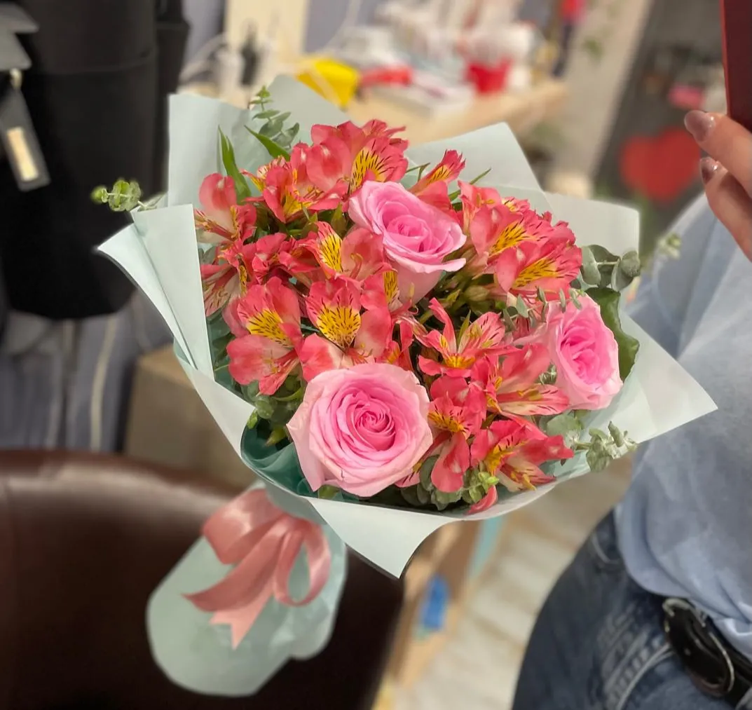 Сочетание этих двух цветов создает удивительную гармонию: яркая энергия альстромерий переплетается с мягкой романтикой роз, рождая букет, который излучает свежесть, радость и яркое очарование. Букет дополнен легкой зеленью, создающей фон и подчеркивая великолепие самих цветов.