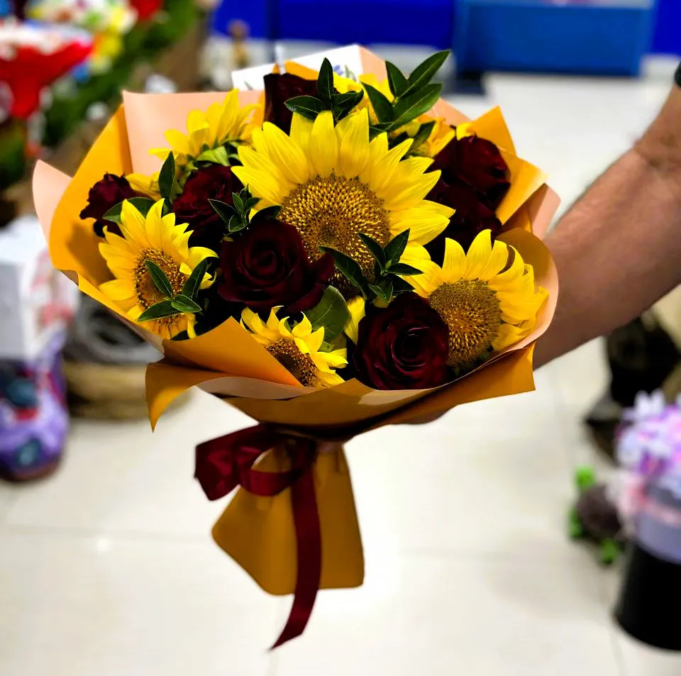 Заказывая букет из красных роз с подсолнухами, вы выбираете не только элегантность, но и символику, которая дарит радость и вдохновение.