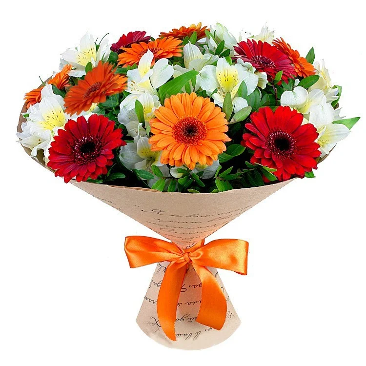 - Средний (гербера - 9 шт., альстромерия - 6 шт., зелень, упаковка, лента)