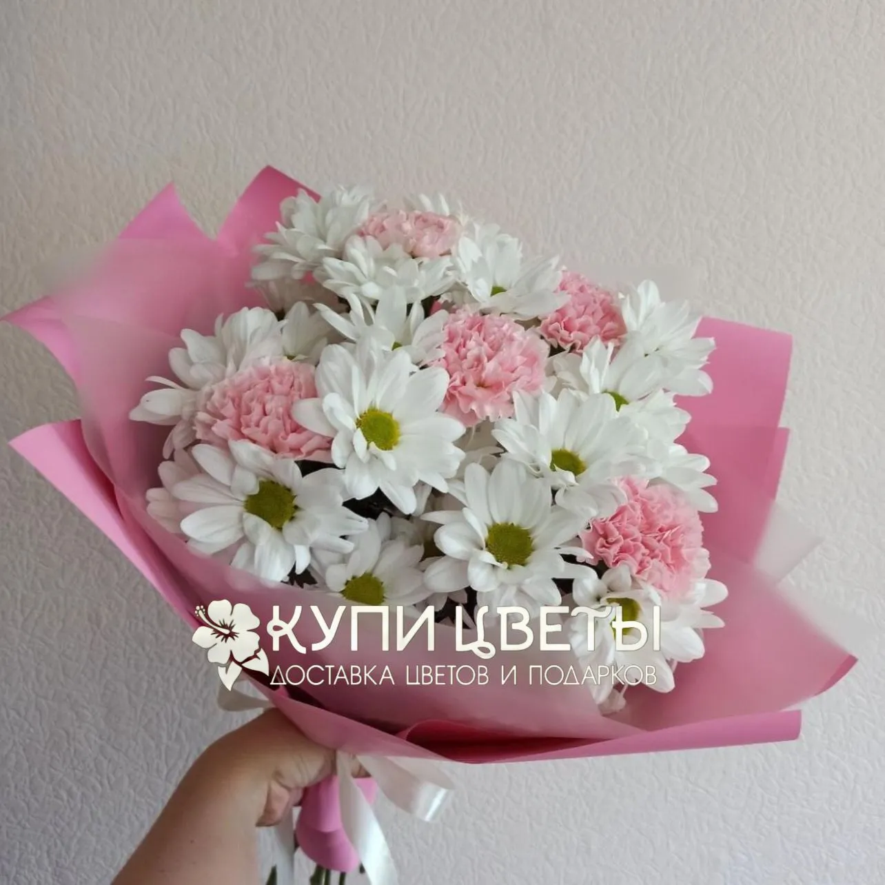 Вариант—Стандарт - гвоздики - 5 шт., кустовая хризантема - 2 шт., зелень, упаковка, лента