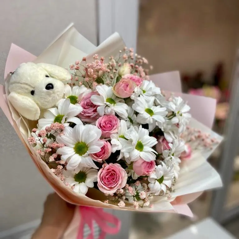 Кустовая хризантема, кустова роза, гипсофила, игрушка, упаковка, лента