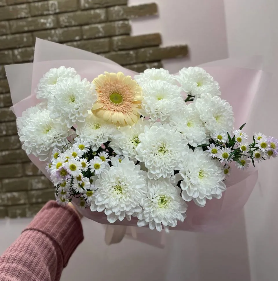 Этот яркий и нежный букет, состоящий из белых хризантем, желтых гербер и ромашек, словно олицетворяет тепло и радость. Белоснежные хризантемы, с их мягкими лепестками, добавляют элегантности и спокойствия, создавая ощущение чистоты и свежести. Их светлый цвет контрастирует с яркими, солнечными герберами, которые словно лучики солнца, наполняя букет энергией и оптимизмом. Ромашки, простые и очаровательные, придают композиции игривость и легкость, символизируя невинность и простое счастье.